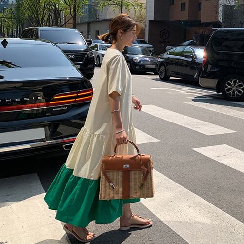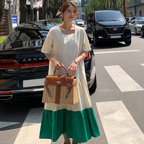 夏 サマー ワンピース バイカラー 半袖 マキシ丈 ティアード ツートンカラー 配色 ロング スクエアネック RB-R4-05-BY-SA-029
