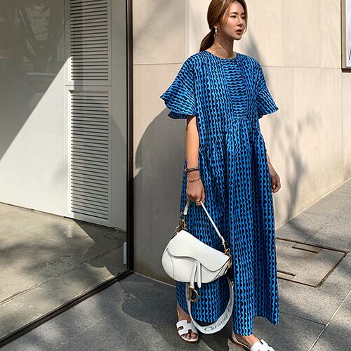 夏 サマー ワンピース オーバーサイズ A字スカート ロング丈 レトロデザイン ボリュームスリーブ RB-R4-05-BY-SA-034