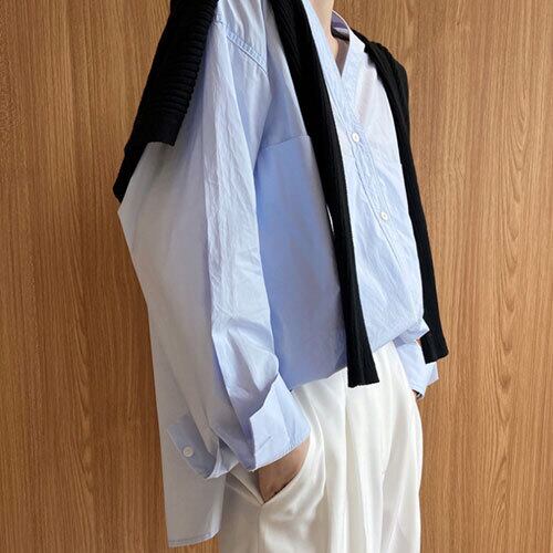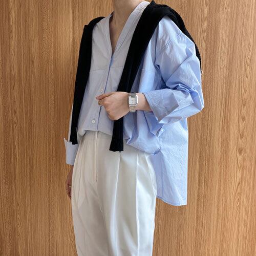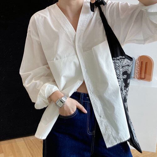 夏 サマー スキッパーシャツ Vネック ノーカラー ダブルポケット ビックシルエット 長袖 シンプル トップス RB-R4-05-BY-SA-038