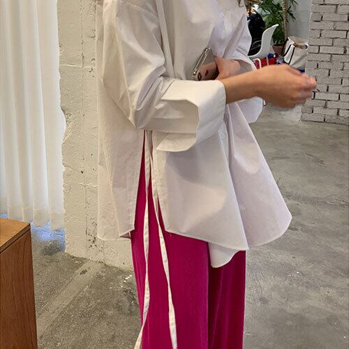 夏 サマー シャツ ロング サイドリボン スリット アシンメトリー ブラウス フロントボタン ロングスリーブ 羽織 RB-R4-05-BY-SA-040