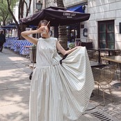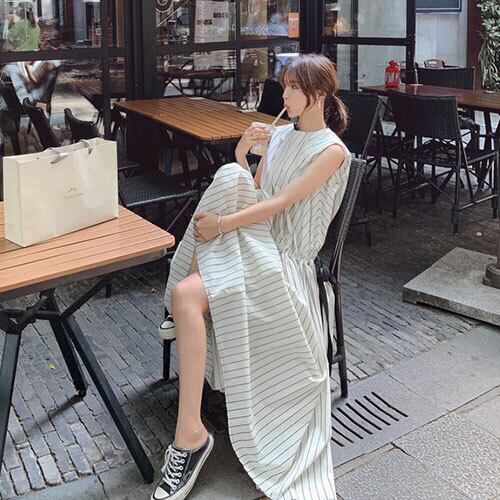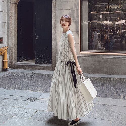 夏 サマー ワンピース ノースリーブ ストライプ リボン Uネック ギャザー ロング フレアスカート マキシ丈 RB-R4-05-BY-SA-051