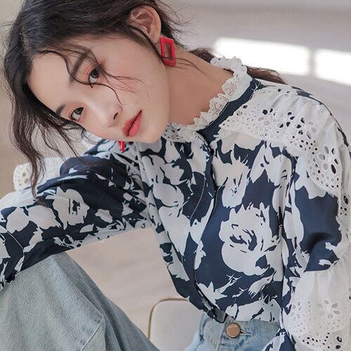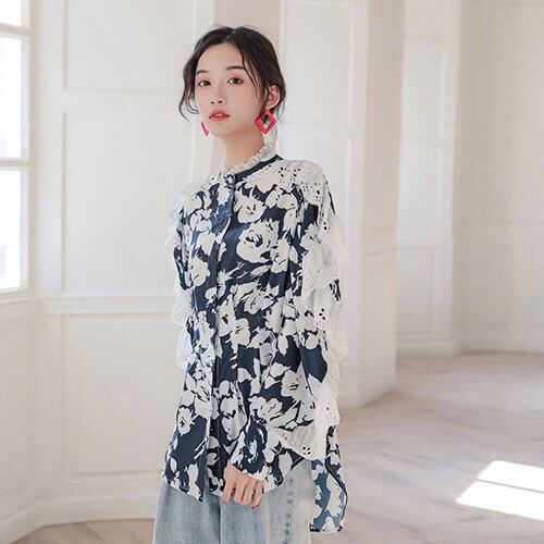 夏 サマー 長袖ブラウス 花柄 レース フリル スタンドカラー RB-R4-05-BY-SA-057