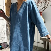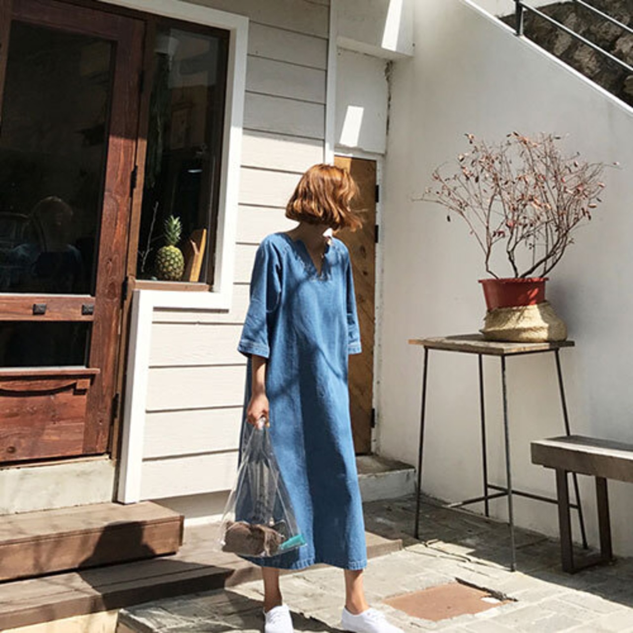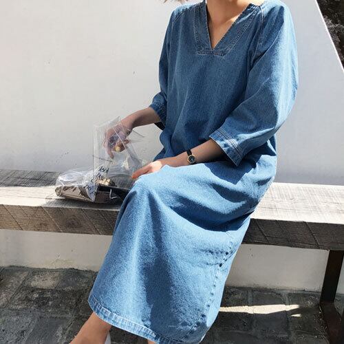 夏 サマー Vネック デニム ロングワンピース 七分袖 マキシ丈 ジーンズ オーバーシルエット RB-R4-05-BY-SA-073