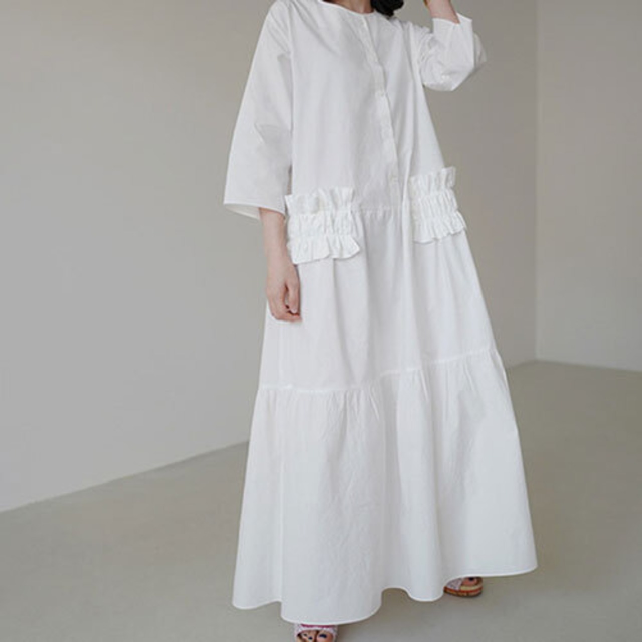 夏 サマー ティアードワンピース 7分袖 フリル フロントボタン フレアロング マキシ丈 RB-R4-05-BY-SA-076