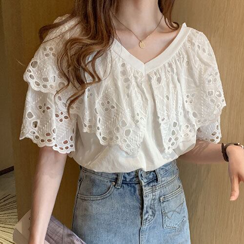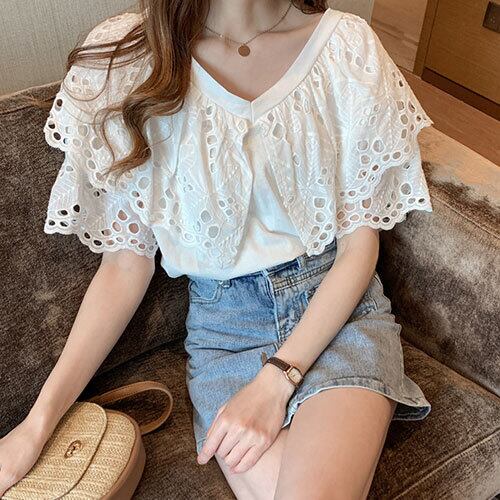 夏 サマー Vネック レースステッチ ルーズ ミドル丈 半袖 全2色 RB-R4-05-BY-SA-124