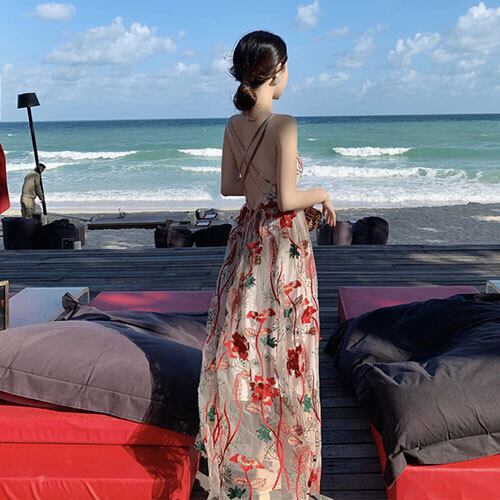 夏 サマー フラワー刺繍 Aライン バッククロス マキシ丈ワンピース リゾート RB-R4-05-BY-SA-132