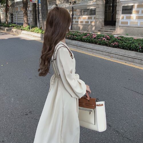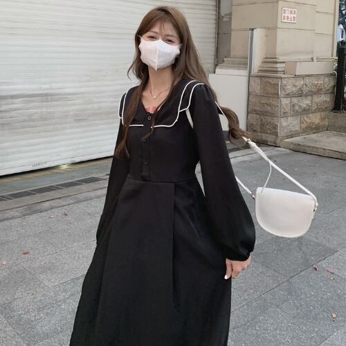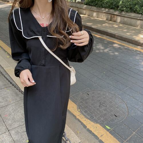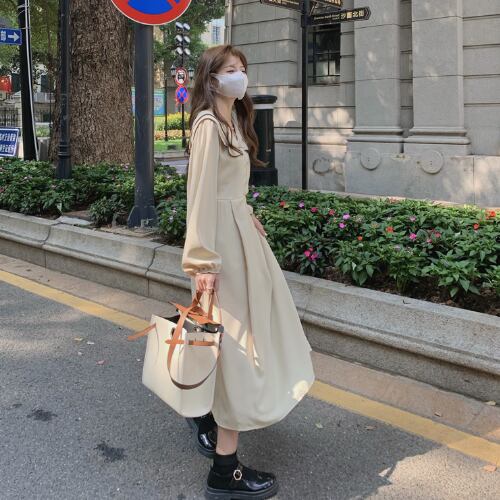 夏 サマー ワンピース 長袖 フレンチ 無地 ハイウエスト Aライン ロング丈 全2色 RB-R4-05-BY-SA-134