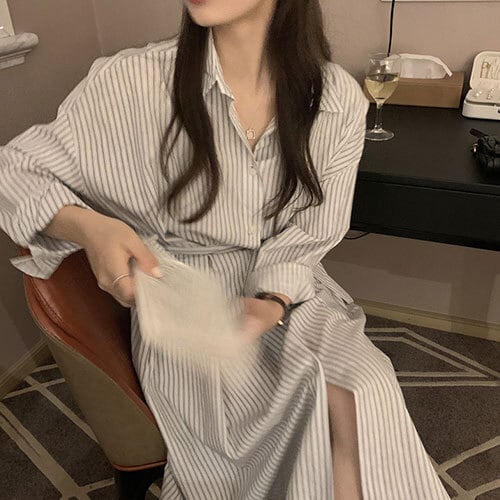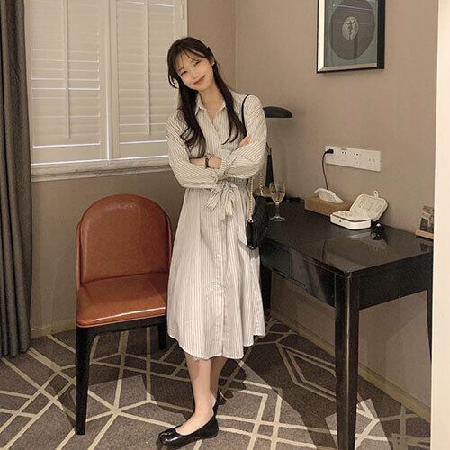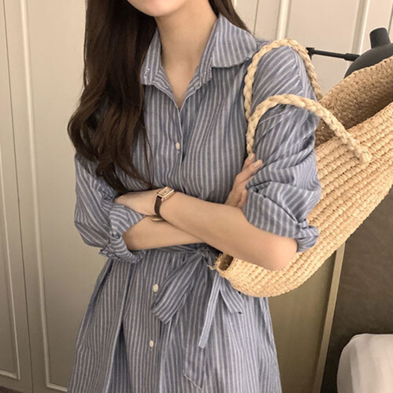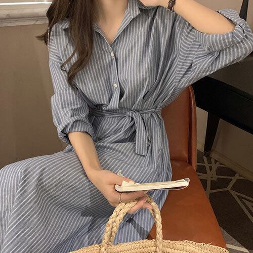 夏 サマー 2色 シャツ ワンピース ドレス Aライン ストライプ 共ベルト RB-R4-06-BY-SA-038