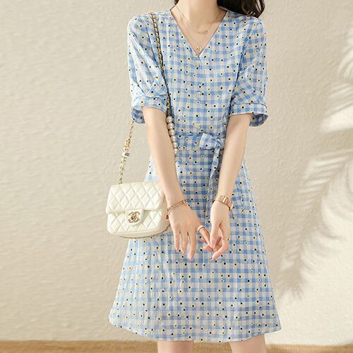 夏 サマー ワンピース Vネック 膝丈 ウエストベルト ギンガムチェック 涼しげ RB-R4-07-TA-SA-041