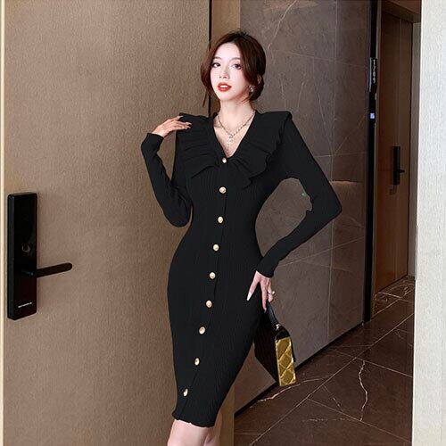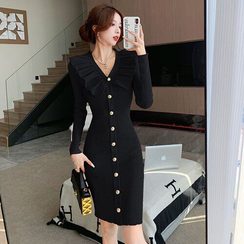 フリル V襟 アンティーク調 長袖 ニッティング ワンピース 女 コート ジャケット アウター ワンピース レディース 秋 冬 半袖 長袖 きれいめ ロング 可愛い かわいい 膝丈 ひざ丈 20代 30代 40代 マキシ タイト レトロ モダン 白 黒 RB-R4-12-NS-SA-035