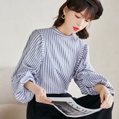 プチハイネック ストライプ柄 ボリューム袖 ブラウス トップス ボリューム袖 ハイネック コート ジャケット アウター ワンピース レディース 秋 冬 半袖 長袖 きれいめ ロング 可愛い かわいい 膝丈 ひざ丈 20代 30代 40代 マキシ タイト レトロ モダン 白 黒 RB-R5-01-NS-SA-009
