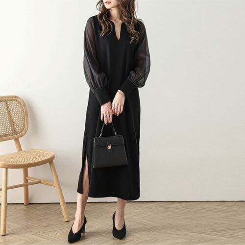 ワンピース 長袖 ミモレ丈 透け感 上品 Vネック 大人 綺麗め トップス ワンピース レディース 春 夏 半袖 長袖 きれいめ ロング 可愛い かわいい 膝丈 ひざ丈 20代 30代 40代 マキシ タイト レトロ モダン 白 黒 2023 RB-R5-03-NS-SA-015