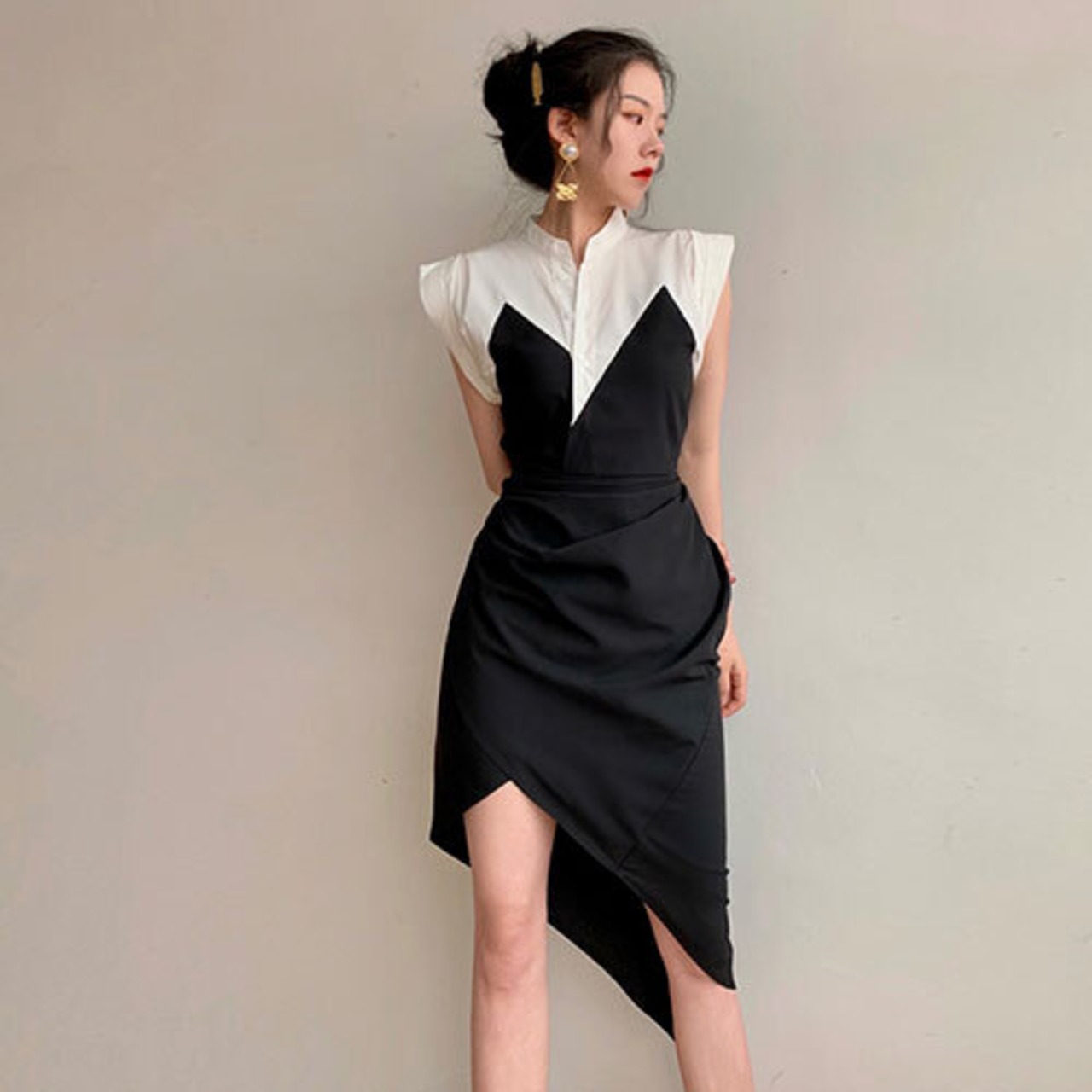 イレギュラー シャツワンピ ワンピース ジャンパースカート 夏 スリム トップス ワンピース レディース 春 夏 半袖 長袖 きれいめ ロング 可愛い かわいい 膝丈 ひざ丈 20代 30代 40代 マキシ タイト レトロ モダン 白 黒 2023 RB-R5-03-NS-SA-089