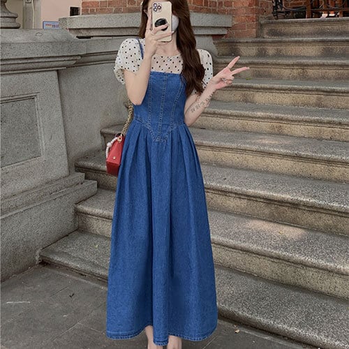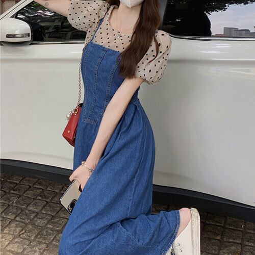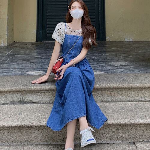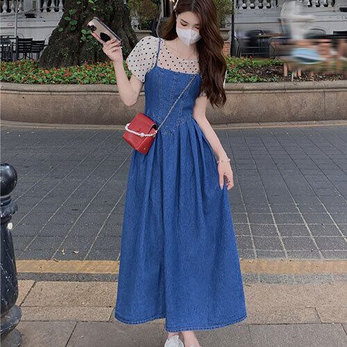 西洋風 デニム ワンピース 女 夏 年 新しいデザイン アンティーク調 気質 ハイウエスト ベスト ロングスカート トップス ワンピース レディース 春 夏 半袖 長袖 きれいめ ロング 可愛い かわいい 膝丈 ひざ丈 20代 30代 40代 マキシ タイト レトロ モダン 白 黒 2023 デニム デニムワンピース RB-R5-04-NS-SA-019
