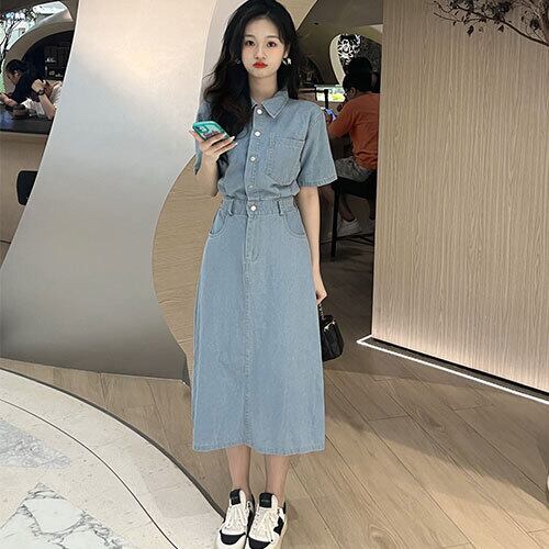 韓国シリーズ ボンシック 半袖 デニム ワンピース 女性服 春 新しいデザイン 設計感 腰締め 中長スタイル A型スカート トップス ワンピース レディース 春 夏 半袖 長袖 きれいめ ロング 可愛い かわいい 膝丈 ひざ丈 20代 30代 40代 マキシ タイト レトロ モダン 白 黒 2023 デニム デニムワンピース RB-R5-04-NS-SA-056