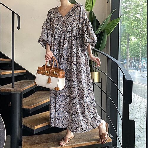 マキシワンピース ロング丈ワンピース 民族風 パフスリーブ Vネック 韓国ファッション トップス ワンピース レディース 春 夏 半袖 長袖 きれいめ ロング 可愛い かわいい 膝丈 ひざ丈 20代 30代 40代 マキシ タイト レトロ モダン 白 黒 2023 デニム デニムワンピース RB-R5-04-NS-SA-064