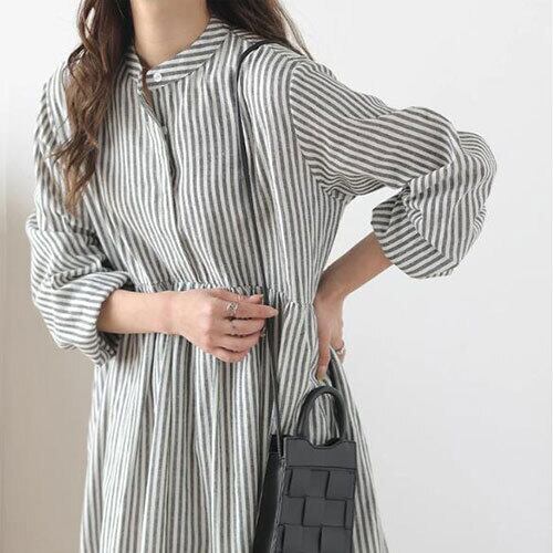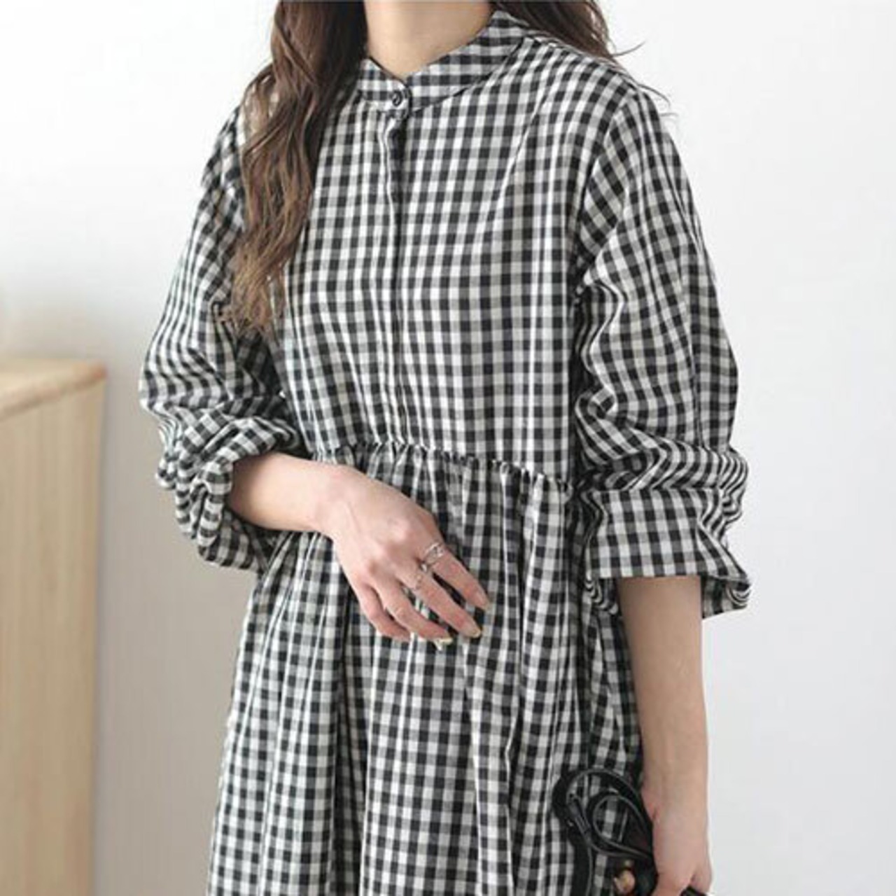 ゆったりシルエット ストライプ ギンガムチェック柄 ギャザー ロングワンピース 袖口ゴム プルオーバー 体型カバ トップス ワンピース レディース 秋 冬 半袖 長袖 きれいめ ロング 可愛い かわいい 膝丈 ひざ丈 20代 30代 40代 マキシ タイト レトロ モダン 白 黒 2023 RB-R5-10-NS-SA-011