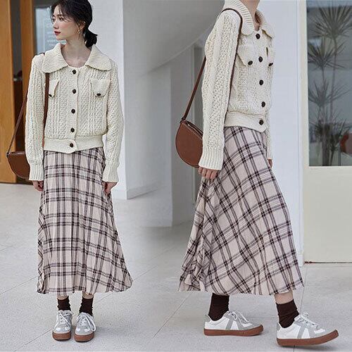秋 冬 新品 スカート エラスティックウエスト 格子縞 中・長セクション 百掛け トレンド トップス アウター ボトムス レディース 秋 冬 半袖 長袖 きれいめ ロング 可愛い かわいい 膝丈 ひざ丈 20代 30代 40代 マキシ タイト レトロ モダン 白 黒 2023 RB-R5-12-NS-SA-143