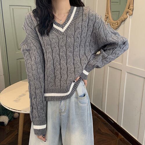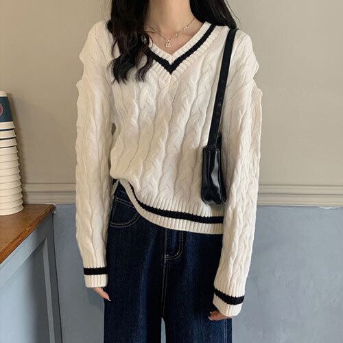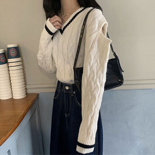 韓国ファッション 秋 冬 Vネック 長袖 セーター 透かし彫り 短いスタイル カラーマッチング 個性 百掛け トップス アウター ボトムス レディース 秋 冬 半袖 長袖 きれいめ ロング 可愛い かわいい 膝丈 ひざ丈 20代 30代 40代 マキシ タイト レトロ モダン 白 黒 2023 RB-R6-1-NS-SA-058