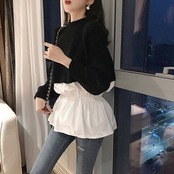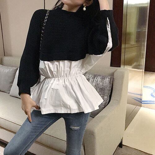 優雅!女性らしい!韓国ファッション ニットトップス 縫付 シャツ エレガント フェイク2ピース トップス アウター ボトムス レディース 秋 冬 半袖 長袖 きれいめ ロング 可愛い かわいい 膝丈 ひざ丈 20代 30代 40代 マキシ タイト レトロ モダン 白 黒 2023 RB-R6-1-NS-SA-069