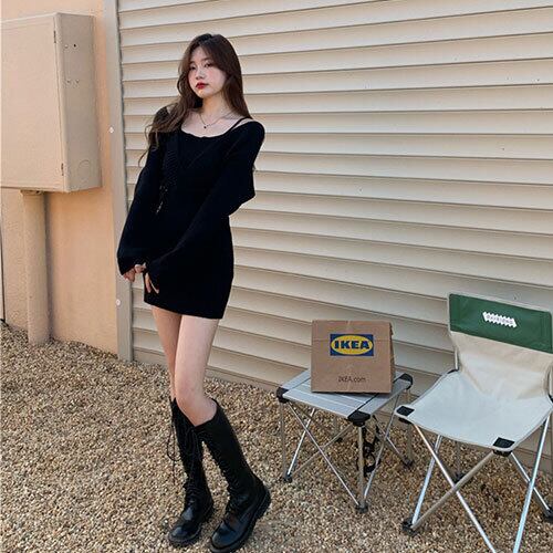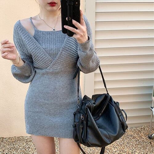 選べる3色 INSスタイル ミニスカート ニットワンピース ギャザリング フェイク2ピース タイトスカート トップス アウター ボトムス レディース 秋 冬 半袖 長袖 きれいめ ロング 可愛い かわいい 膝丈 ひざ丈 20代 30代 40代 マキシ タイト レトロ モダン 白 黒 2024 RB-R6-2-NS-SA-008