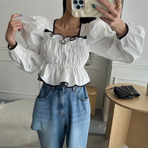 フリル パフスリーブ ブラウス シャツ 上着 春 エレガント 受け取って腰 トップス アウター ボトムス レディース 秋 冬 半袖 長袖 きれいめ ロング 可愛い かわいい 膝丈 ひざ丈 20代 30代 40代 マキシ タイト レトロ モダン 白 黒 2024 RB-R6-2-NS-SA-062